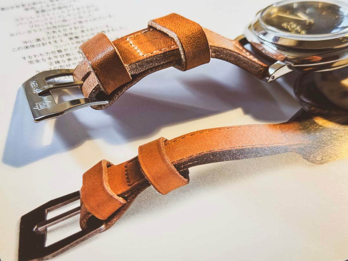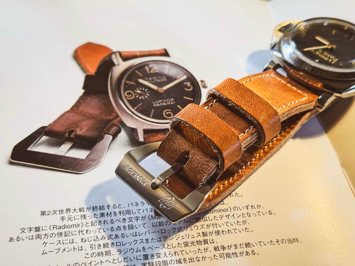 ヴィンテージパネライが載っている本を見てみると、バックルと定革の間にあるステッチがあるのと無いのが存在するんですね。
