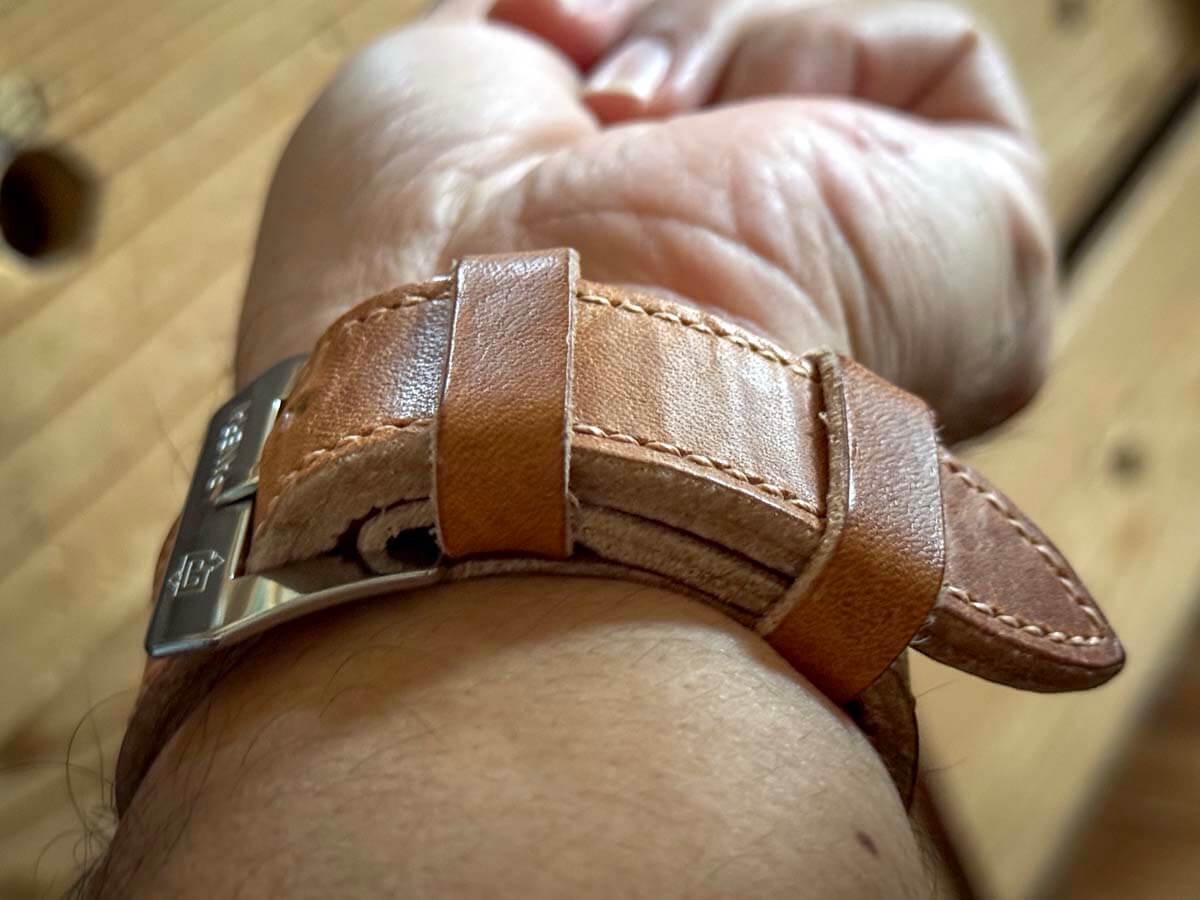純正は私にはベルトがチョット短いのでステッチとチョット接着剤を外してバックルだけ使っています。