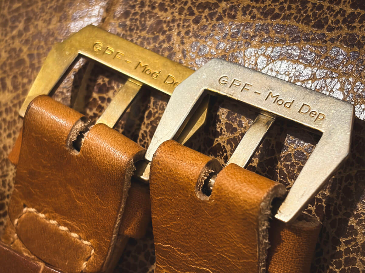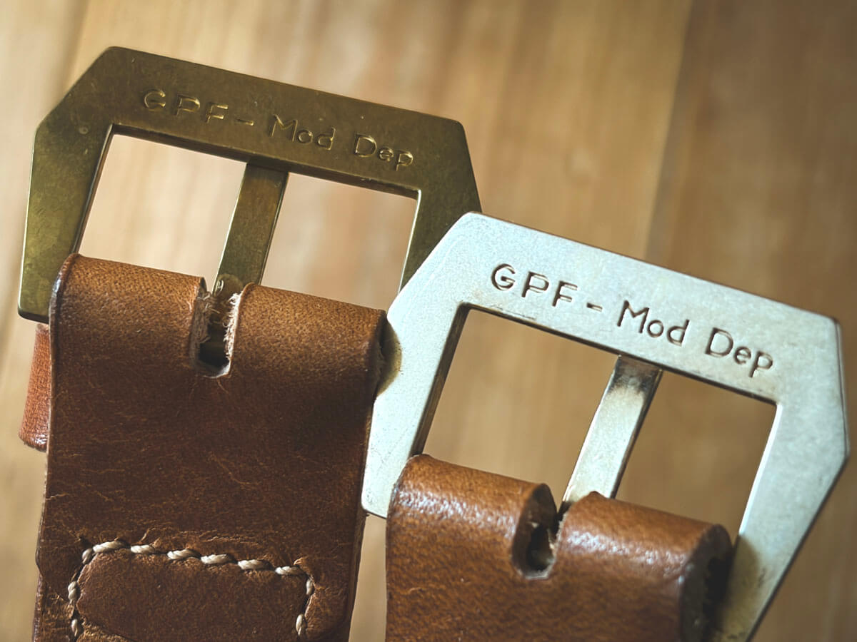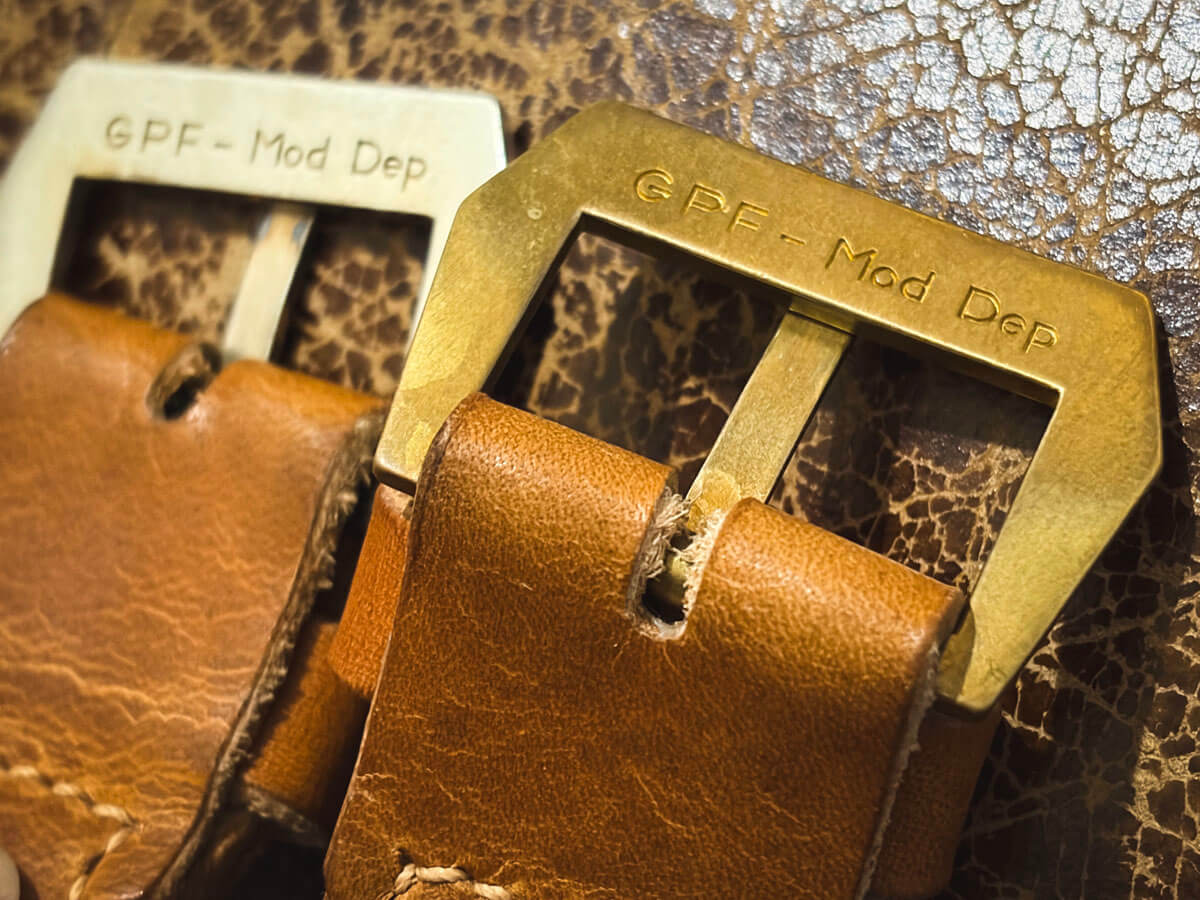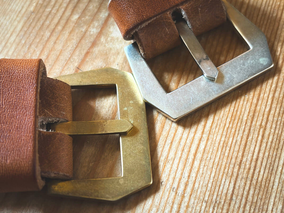 このバックルはバネ棒では無く縫い込み式なのでオーダーでベルトを一緒に作る・・・・