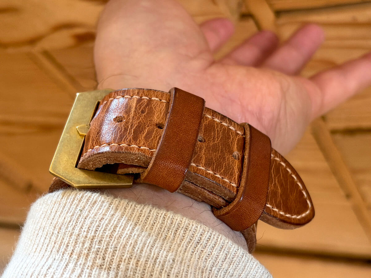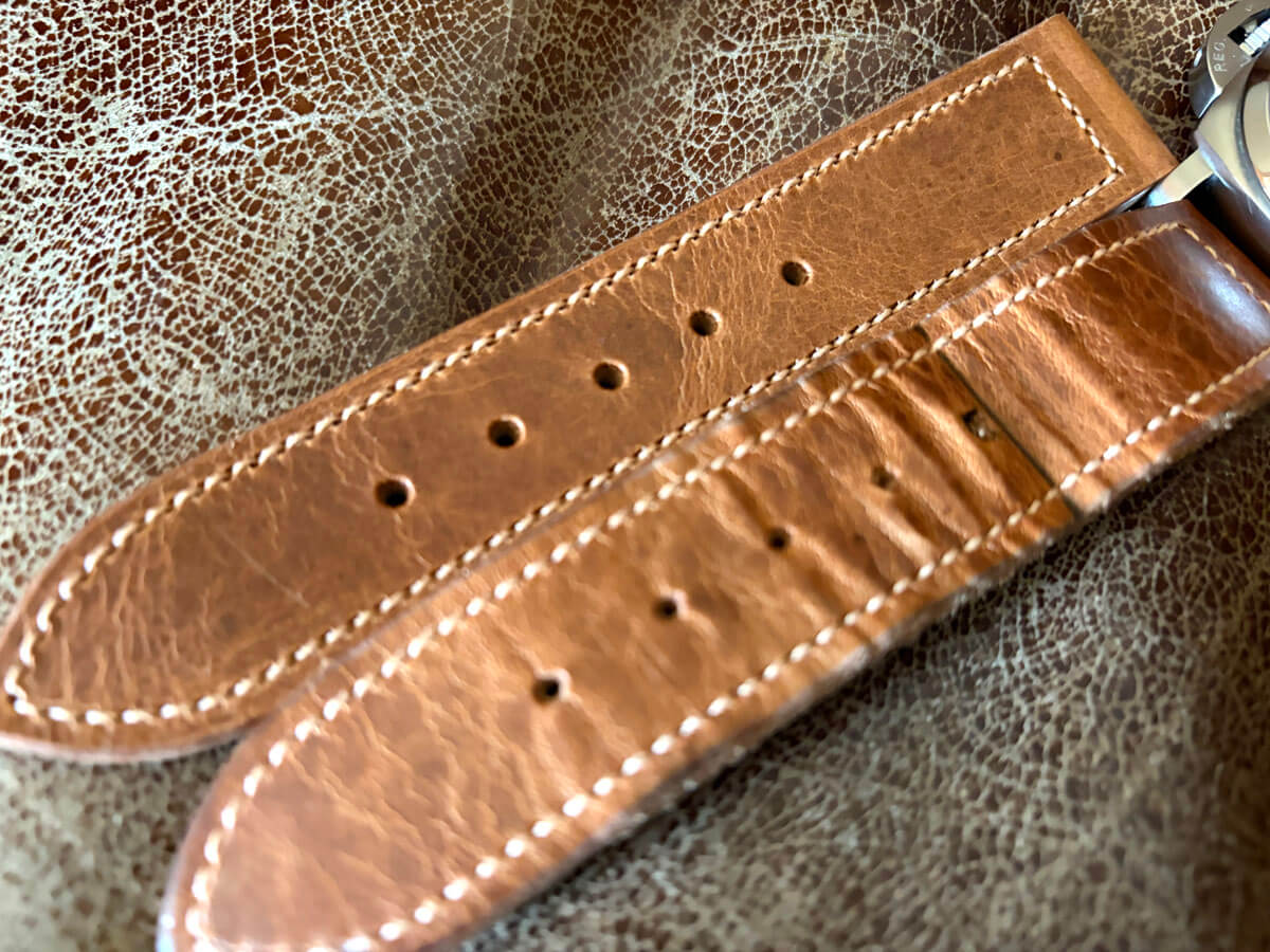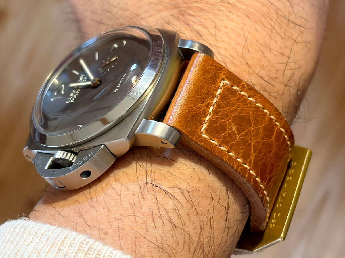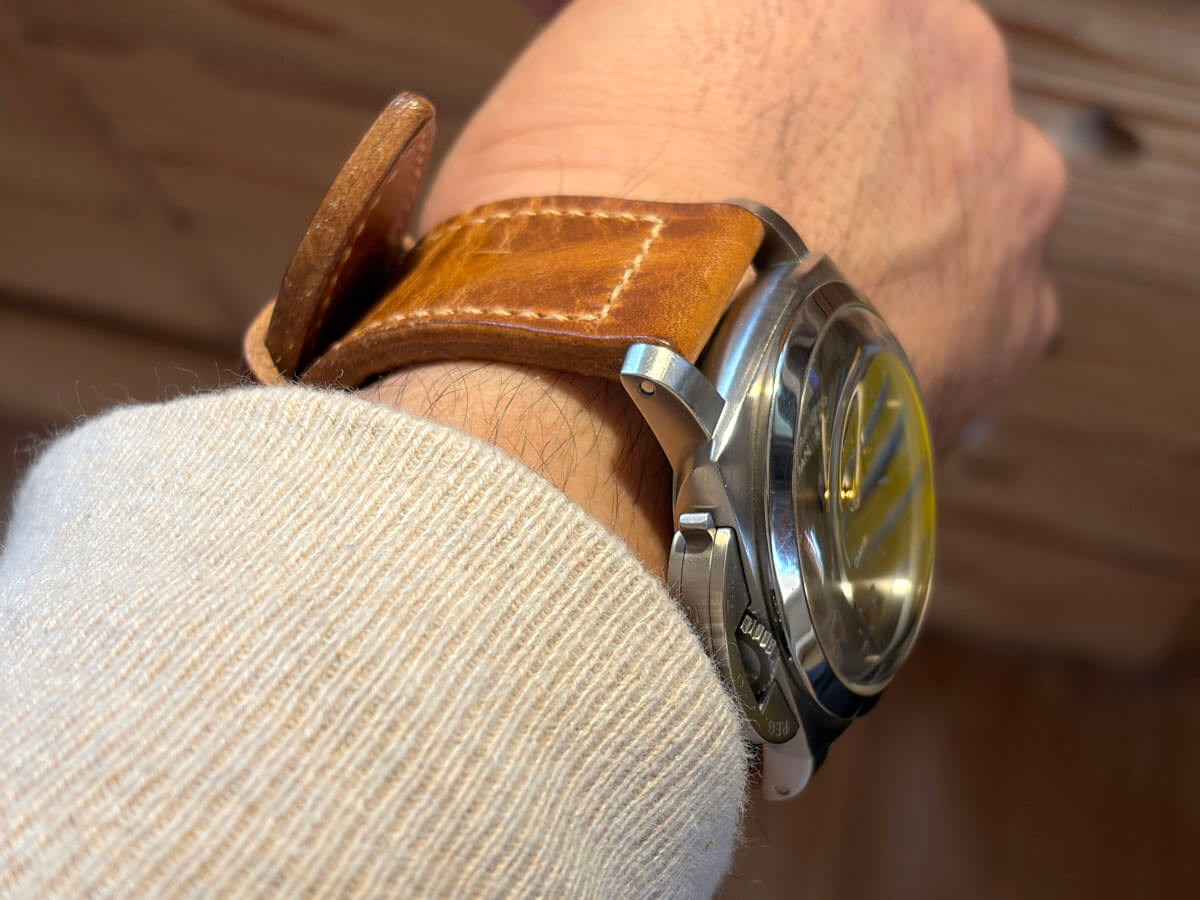ヴィンテージパネライは軍用時計なので用途(ミッション)に合わせた、長目で厚いストラップです。